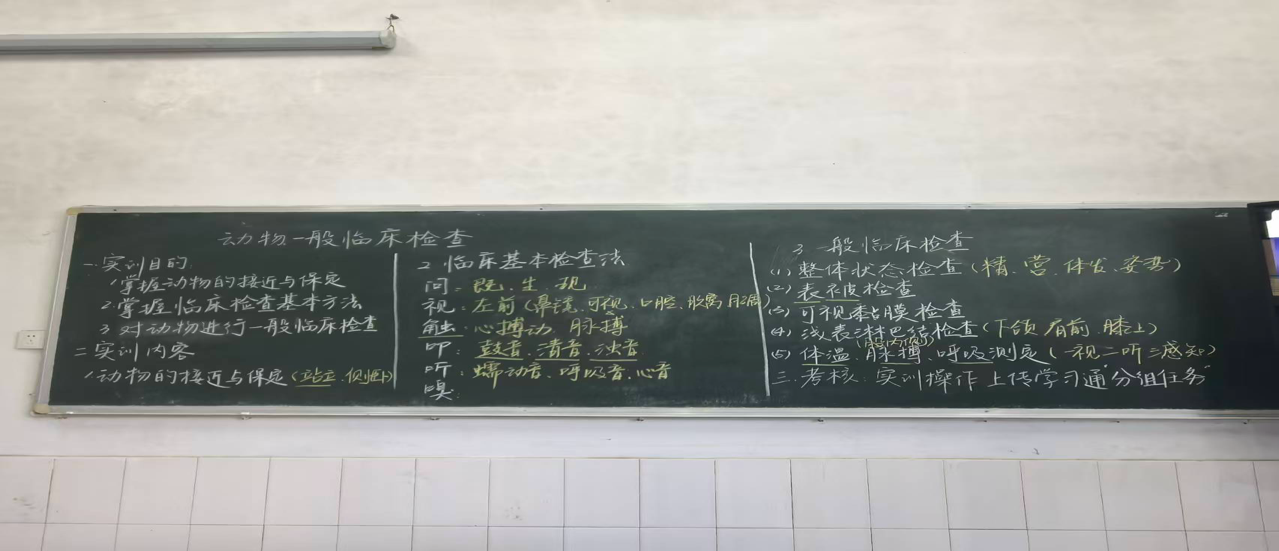 课堂上,授课教师衣蕾首先通过黑板板书清晰梳理了实训目标与核心技能:从动物的接近与保定方法,到问、视、触、叩、听、嗅的临床检查六步法,再到整体状态、表被检查、体温脉搏测定等一般临床检查项目,系统拆解了兽医诊疗的基础流程。