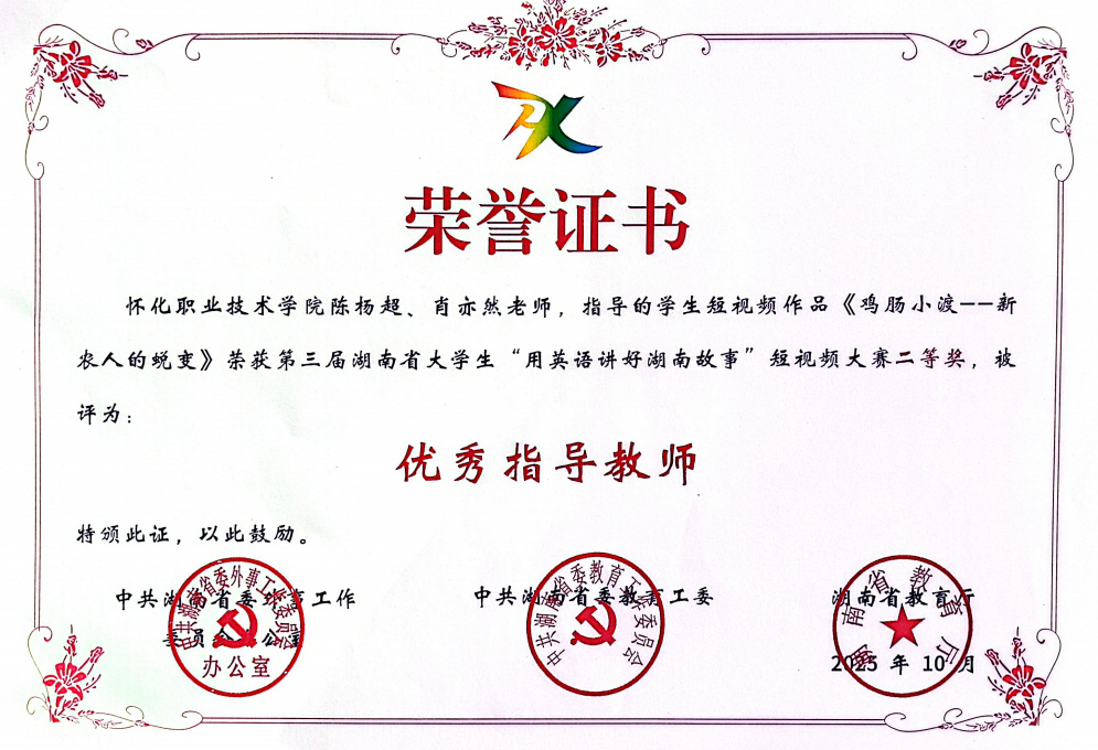 在第三届湖南省大学生“用英语讲好湖南故事”短视频大赛中,怀化职院动物科技学院参赛队伍荣获高职高专组二等奖,刷新了该校在此项赛事中的获奖纪录。本次大赛覆盖全省49所高校、219件作品,竞争激烈程度远超往届。