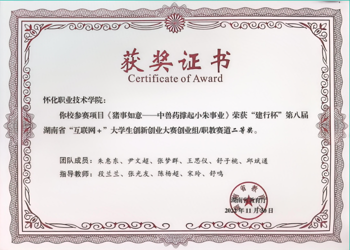 项目《猪事如意——中兽药撑起小朱事业》针对生猪养殖中的疾病防控需求,研发绿色无抗中兽药制剂,有效替代抗生素使用,获湖南省“挑战杯”创业计划竞赛银奖与湖南省“互联网+”大学生创新创业大赛银奖。