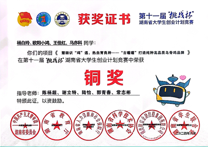 2025年:结合乡村振兴政策,学生团队深入农村调研畜牧产业短板,设计智能化养殖新范式,入围湖南省黄炎培创业规划大赛决赛,项目《慧眼识”鸡”遇》获省级优胜奖。