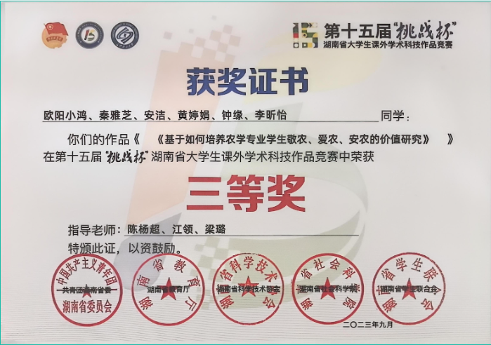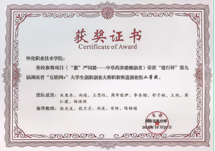 2023年:《“惠”严饲猪》项目,通过生态智能化养殖新模式,打造种养一体化可持续发展创新养殖技术,获得湖南省“互联网+”大学生创新创业大赛银奖