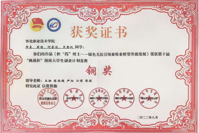2022年:依托武陵山区中药材资源,团队打造《扶“药”殖上》项目,探索“中草药+畜牧养殖”绿色循环模式,实现疫病防治与生态养殖协同发展,获湖南省“挑战杯”创业计划竞赛铜奖。